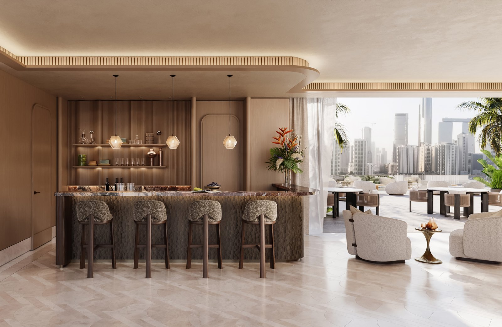 The architecture blends sleek urban lines with soft coastal influences, resulting in a timeless visual identity. Interiors feature calming tones, quality materials, and elegant detailing, while wide balconies extend living areas outward toward panoramic waterfront and mangrove views.